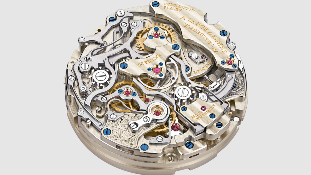 Firstly, the rattrapante. Translated from French, rattrapante effectively translates to “catch up,” which is an overly simplistic way to describe one specific function of the rare complication. Similar to the average chronograph, rattrapante watches retain the chronograph seconds hand in the middle of the watch rather than a sub dial. But the rattrapante watch includes a second chronograph hand in the center of the watch, joining the necessary hours and minutes hands to create a set of four primary hands in this 1815 Rattrapante Perpetual Calendar. When activated, both chronograph hands run together until a pusher can be used to stop the second chronograph hand while the other continues running. The pusher can then be pressed to jump the stopped hand to catch up with the still-running chronograph hand. This elevated chronograph function is seldom seen due to the difficulty of manufacturing and the cost associated with it.