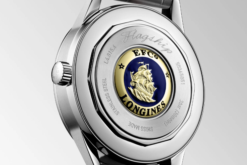 Adorning the closed case-back of the timepiece is an enamel-style medallion featuring the Longines Flagship and corresponding text engraving.